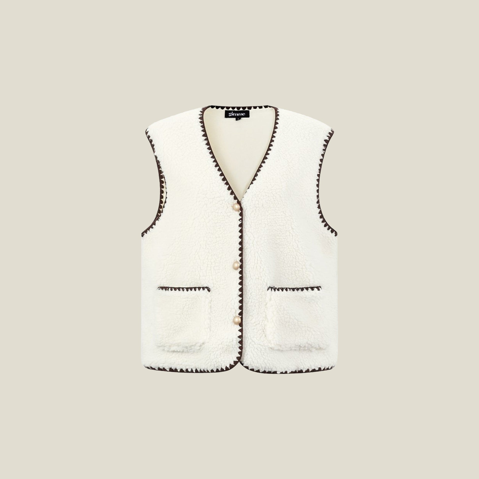 The FLUFFY GILET is a stylish must-have with a luxurious, cozy look. The soft, teddy-like material feels wonderfully warm and instantly adds a sophisticated touch to any outfit. The contrasting piping along the edges adds a chic detail, while the V-neck and button closure give the vest a timeless look.